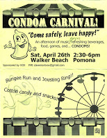 Charles Johnson recently alerted me to the "Condom Carnival" taking place this weekend at Pomona's Walker Beach, sponsored by VOX. VOX is a student mouthpiece for Planned Parenthood operating on the Claremont Colleges. If the event's flier (pictured right) is any indication, there is much for denizens of the Claremont Colleges to be concerned about.