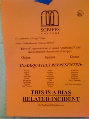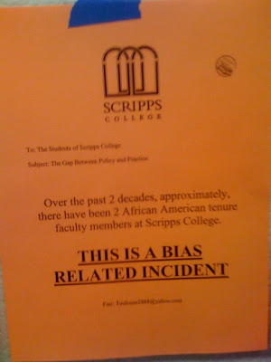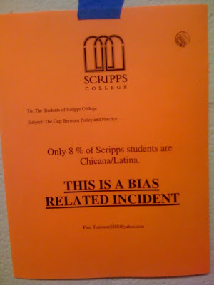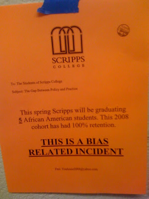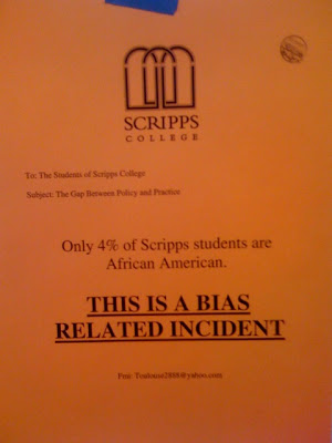 Charles may have blogged before finals, but this one needed to be posted. there's obviously no context to these flyers (only 5 african americans scripps graduates in 2008? out of how many total? what if african american girls simply dont think the claremont colleges, or women's colleges? is that a "bias related incident?). As Charles points out, these flyers are silly with their vague "bias-related incident" headings - whose bias? how can you prove it? they flyers' authors cannot, so they stick a big headline on their so youre not allowed to question their conclusions. they need to be laughed off the tables they are put on - just like if i wrote "i am male and scripps didnt accept me based simply on that ground. Bias related incident" when it clearly was not. finally, charles makes the ultimate point when none of the flyers bemoans the diversity of thought on campuses, just people's skin color.