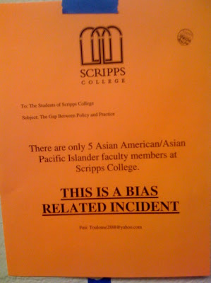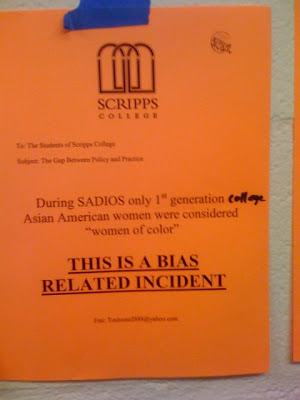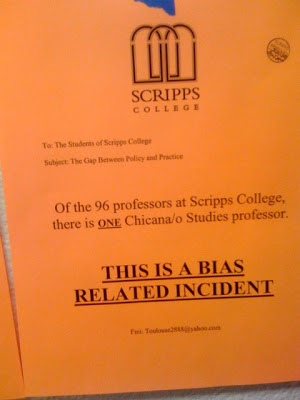 One of my friends visited Scripps College and photographed all of these fliers for us. I think they are very revealing about the kind of culture that many people want to instill on our 5-College campuses. In this case, they want to change the culture of Scripps College to be more racially and ethnically diverse. Notice how they use the nebulous phrase "bias-related incident" -- a phrase we've discovered means whatever its users want it to mean. It's newspeak for the P.C. police among us.