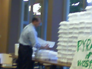 The green message gets broadcast in a variety of ways: at Claremont-McKenna College in California, students erected a giant Pyramid of Waste — an expansive stack of Styrofoam to-go containers — designed to encourage students to eat in.Naturally, I fired off a letter to the editor reminding them how the self-described "Environmental Crusaders" cooked the books about how much waste we actually saved and how we protested their busy bodiness. I also paid careful attention to how they took a photo of themselves and left others to clean up their mess. Dan O'Toole took a picture with his camera phone.